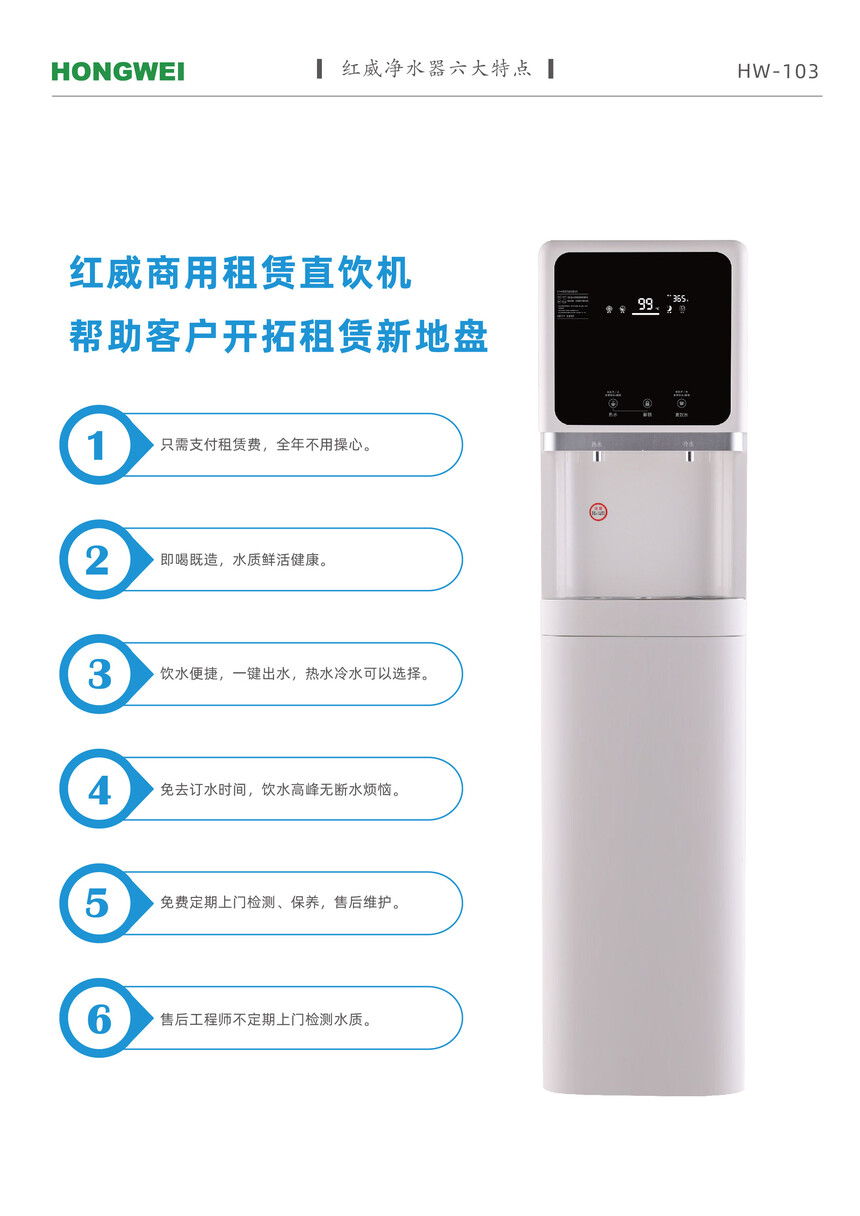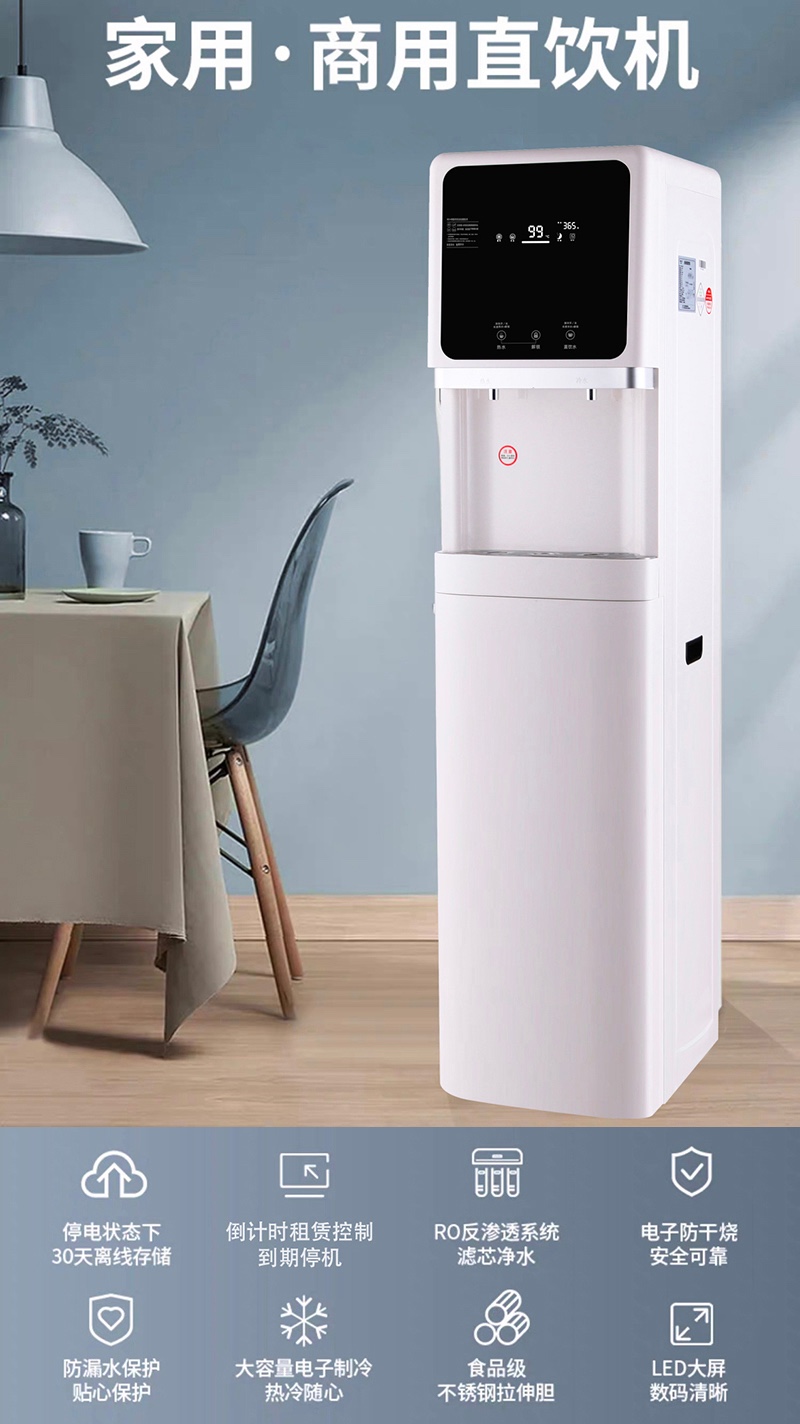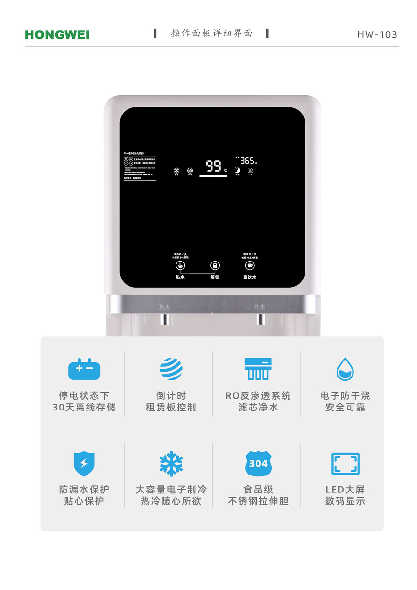 1、智能电脑板标配:热水温度显示(温度可调)、UV杀菌(管线机选配,直饮机标配)、租赁倒计时控制(可以卖断)、触摸屏电磁阀放水带儿童防烫锁(可以取消)、带漏水保护、自动休眠功能(0-5小时可设)