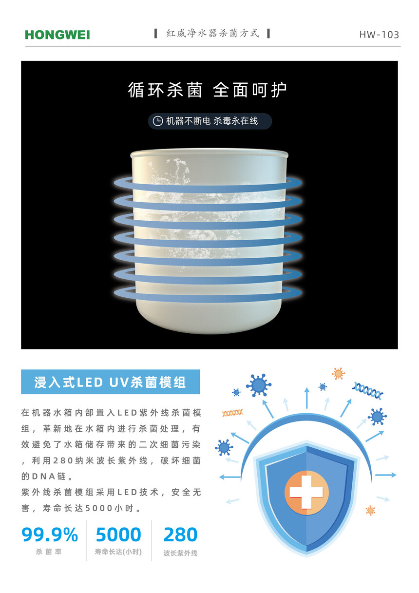 3、浸入式LED UV杀菌,杀菌率99.99%(管线机选配,直饮机标配);